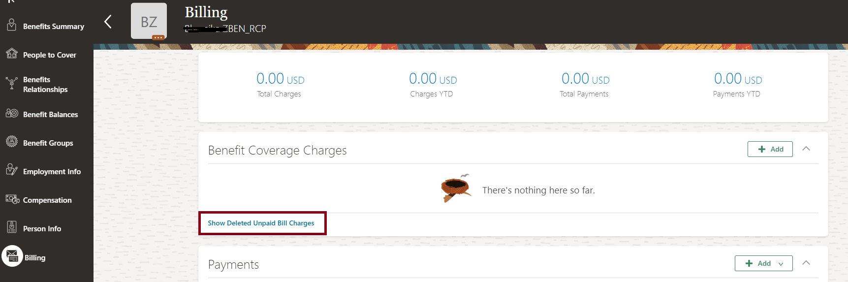 You can now delete incorrect billing charges that are in unpaid status from the Billing page in Benefits Service Center. After you delete the charges, the data is restored to how it was before. For example, you want to waive off billing charges for some employees after the bills have been generated. These billing charges are in unpaid status and you can delete them. When you delete the charges, they neither appear on the employee’s Year to Date totals (YTD) nor appear as dues in the subsequent bills.
