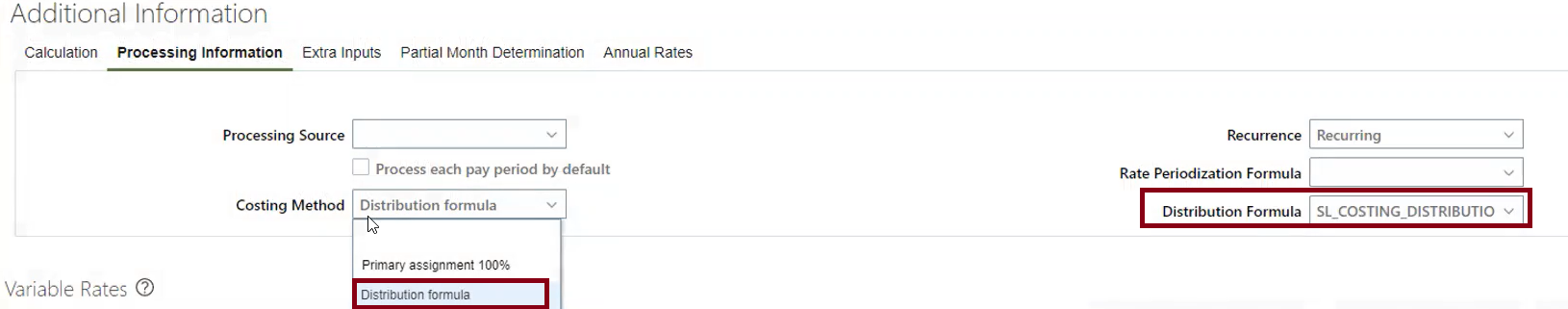 Select Distribution Formula from the dropdown list named Costing Method in the Processing Information tab on the Additional Information section.
