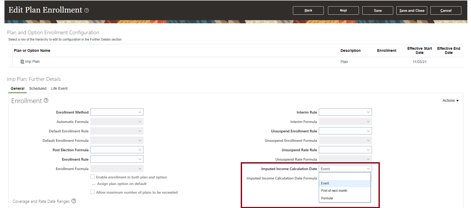 Before evaluating the life event, you need to specify when to calculate the coverage amount of the imputed income. This will ensure that only the coverages that are active as of the evaluated date are considered for imputed income calculation.