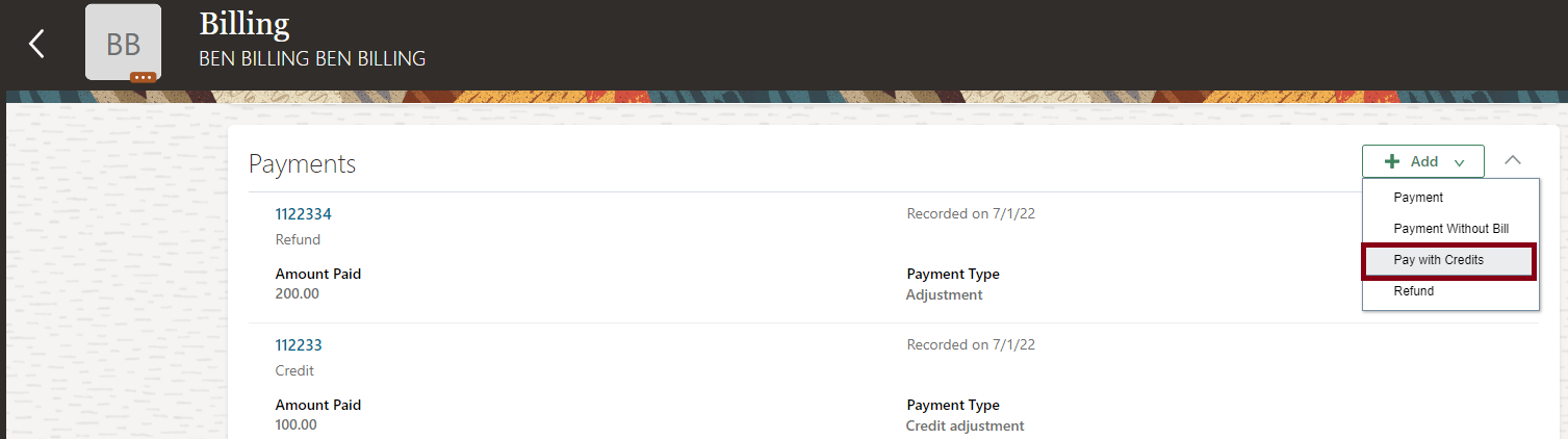 For example, the benefits administrator generates health coverage charges of $500 for June. The participant overpays $1000 and expects the excess credit of $500 to be used for the July bill. You can use the new Pay with Credits option on the Billing page of Benefits Service Center to apply the credits. Previously, a subsequent payment was needed for you to apply the excess amount. For multiple credit adjustments, you can use the Upload Billing Payments workbook available in the Person Data Loaders tab of the Evaluation and Reporting work area.
