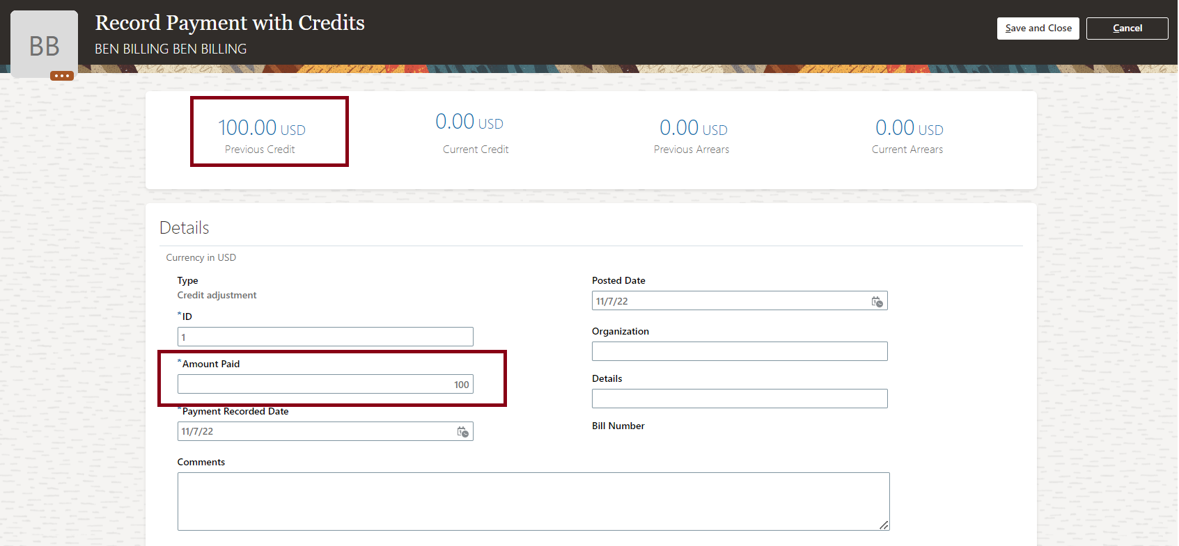 Follow the prompts to apply credits. You can apply only the amount that is less than or equal to the previous credits. The balance amount after applying the credit appears as current credit.