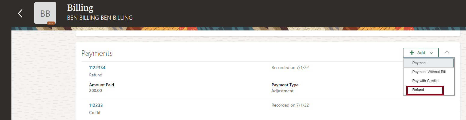 - In the Payments section, select Add, and click Refund.