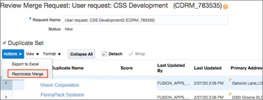 The Reprocess Merge Requests feature is available to users with the Customer Data Steward, Customer Data Steward Manager, or Master Data Management Application Administrator job roles.