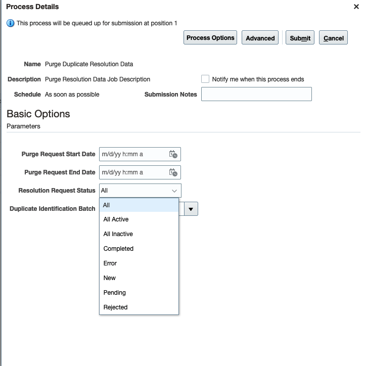 Remove unwanted, active resolution requests with the Purge Duplicate Resolution Data scheduled process. In this release, we have enhanced the functionality of the Purge Duplicate Resolution Data scheduled process to allow the purging of resolution requests in New and Pending status. We've also provided the ability to restricted the purge scope to resolution requests created from a specific duplicate identification batch.