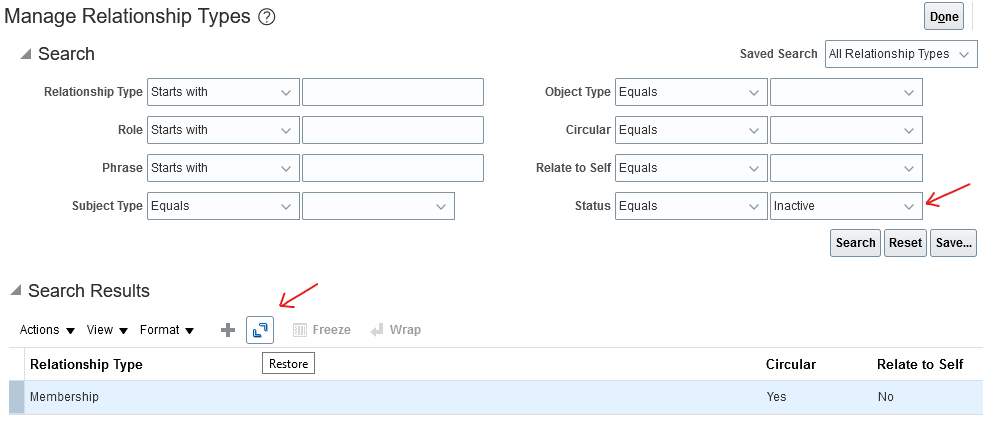 Setup and Maintenance tasks let you filter records based on active or inactive status. Deleted records appear in search results with a status of inactive. The Restore button also appears when you search for inactive status records. Selected records can be restored using the restore option.