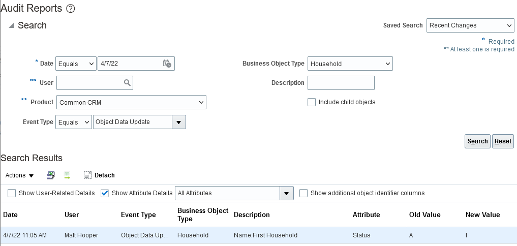 Track deleted household object records using the Audit reporting tool. This feature is supported from all channels, including changes made in the UI, using REST, and using Import Management. You may have to perform certain configuration steps for the Household object and for specific fields to enable auditing.