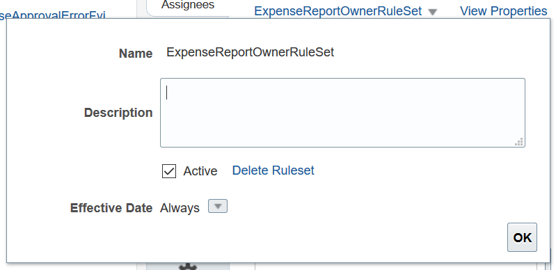 - To delete a rule set and see its effective dates and active setting, click the View Properties link after the rule sets list of values.