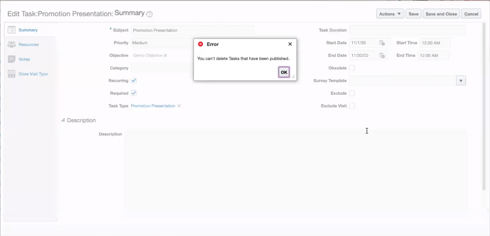 - By preventing deletion of tasks that are already published. Deleting tasks from an objective or contract that was published to accounts creates data inconsistencies. The administrator supposes that the task is deleted from consideration for the Sales field, but it remains and can be executed across accounts. This feature prevents deletion of published tasks. The administrator must modify the status or dates of tasks to obsolete them or request an update of all matching child tasks across accounts.