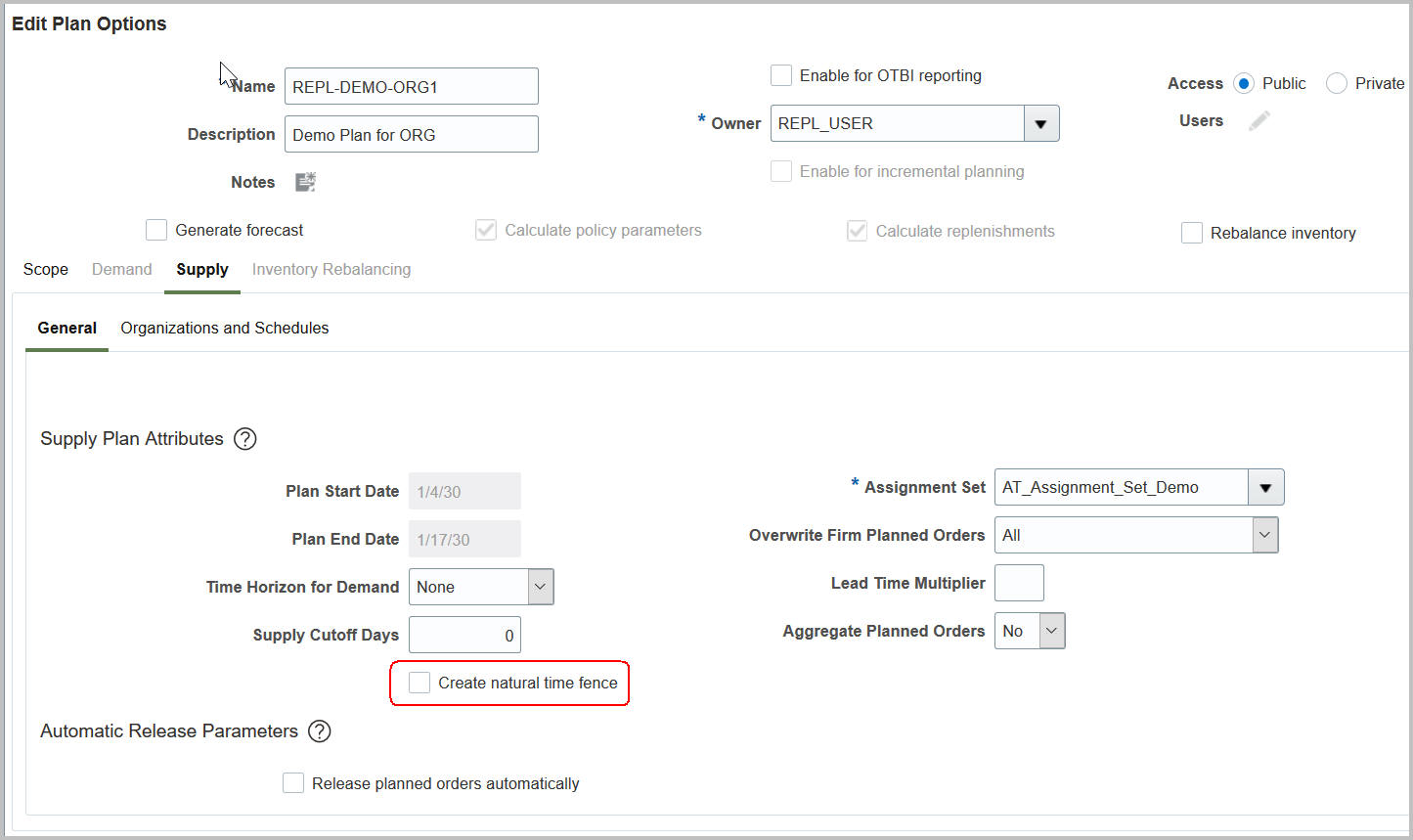You select the Create Natural Time Fence plan option to use this new feature. This plan option applies to both transfer orders and purchase orders.