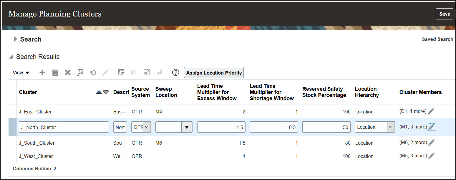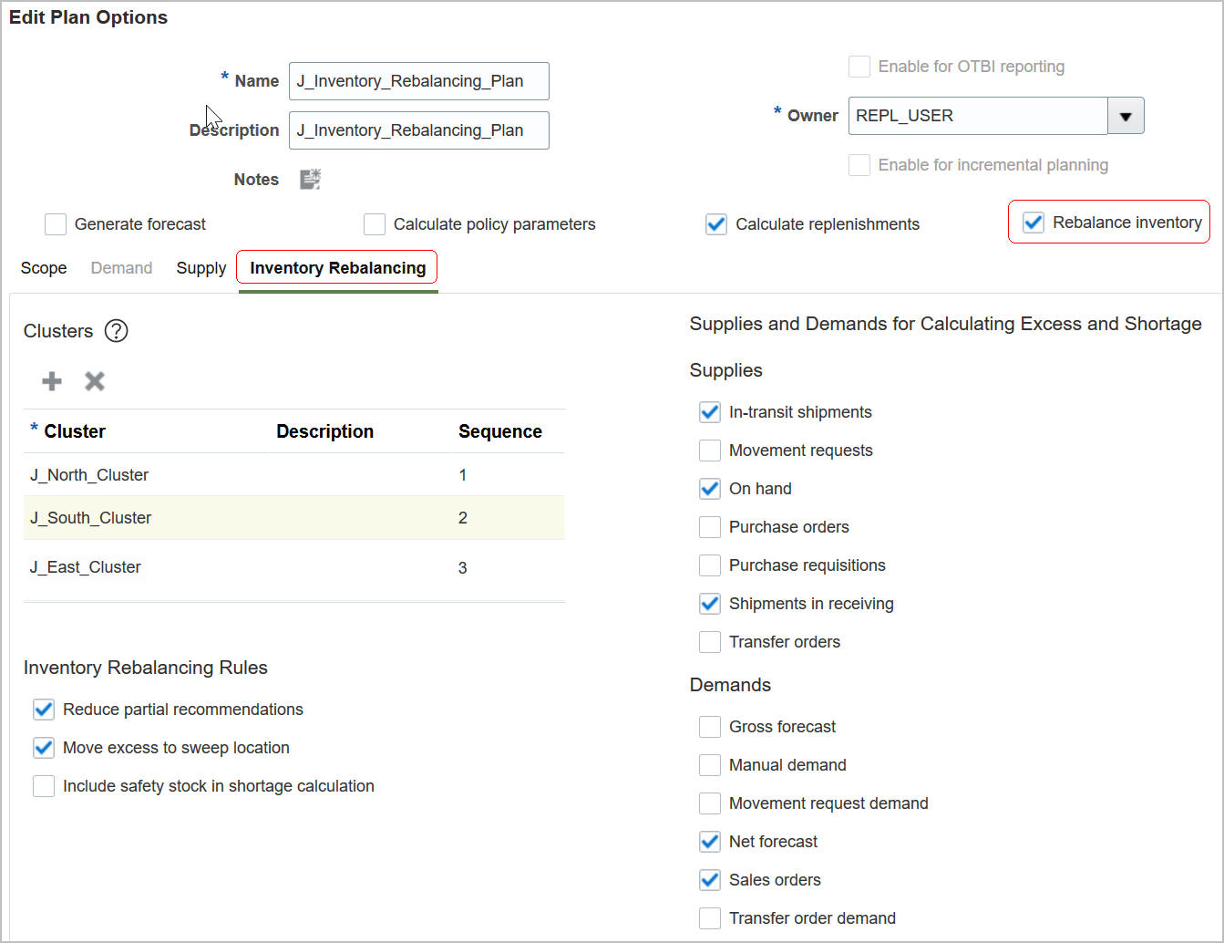 - Configure clusters consisting of locations using Manage Planning Clusters task and specify cluster attributes that will be used in the inventory rebalancing process. You may also use a REST resource planningClusters to configure clusters.