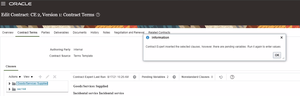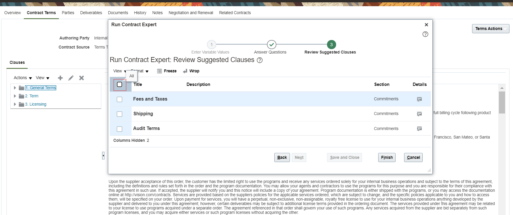 After the Contract Expert process completes, a message prompts you to enter the values for the pending variables. The View field in the Edit Variable Values page is set to Pending variables by default to focus on those variables that don't contain values. In addition, you can view the Display Title and Number columns in the Contract Expert: Review Suggested Clauses train stop. If Contract Expert suggests multiple clauses, you can use a single checkbox to select or deselect all clauses at a time with one click.
