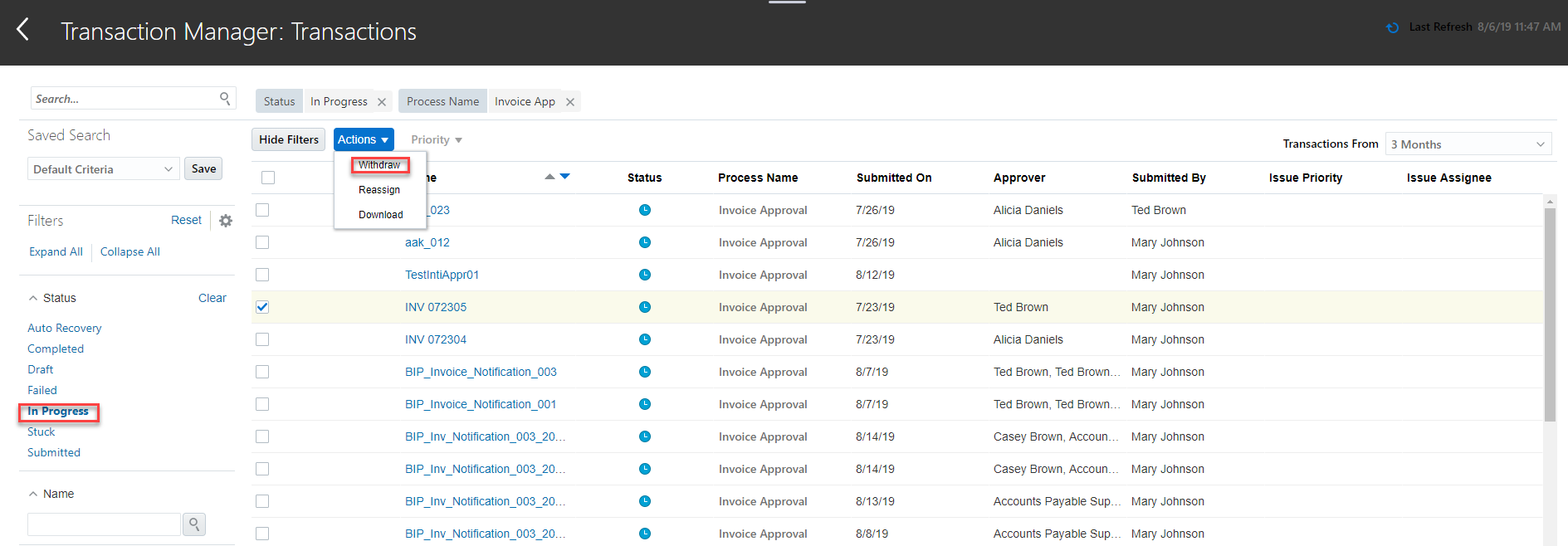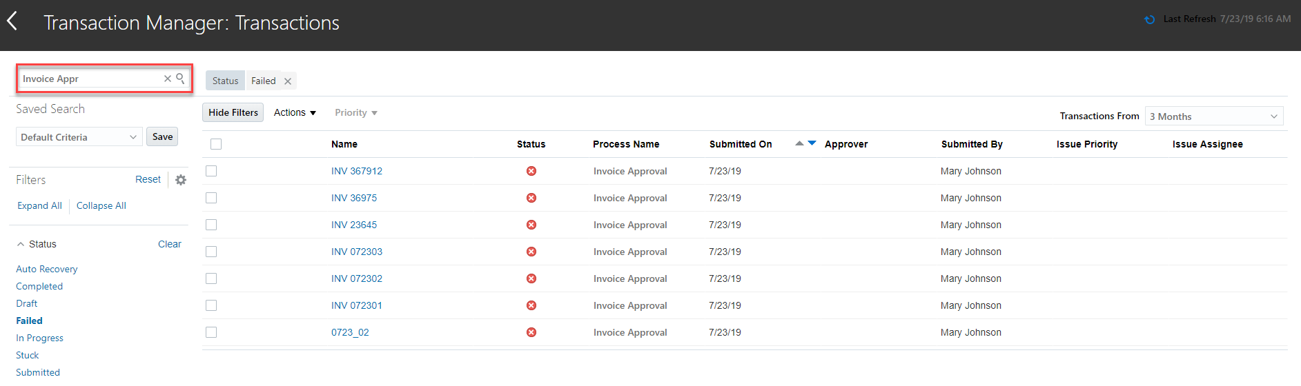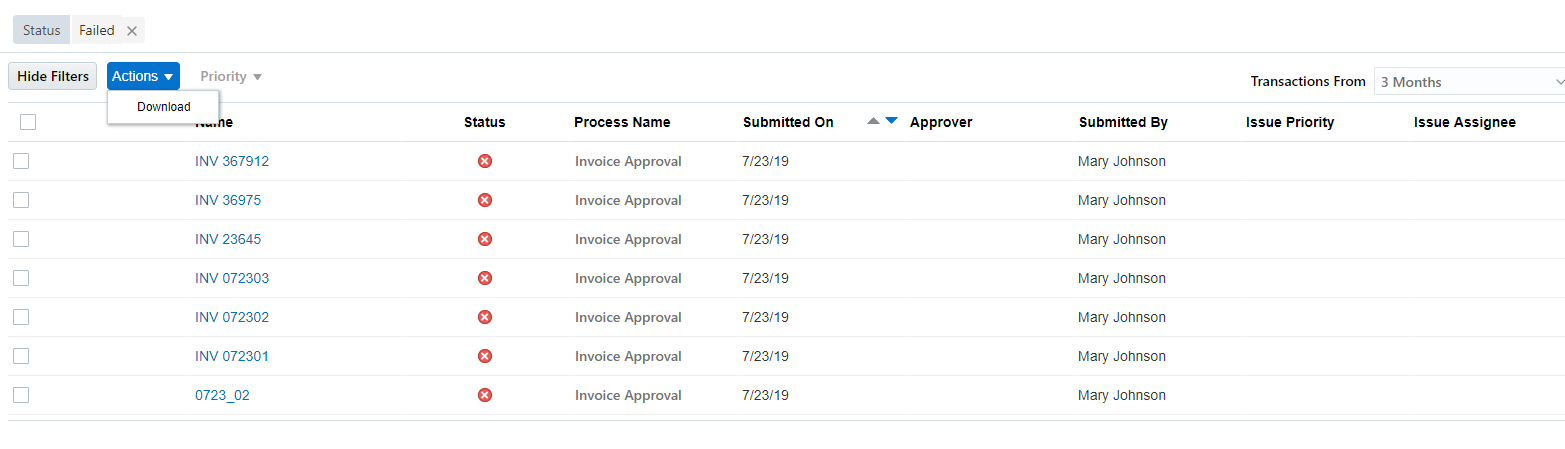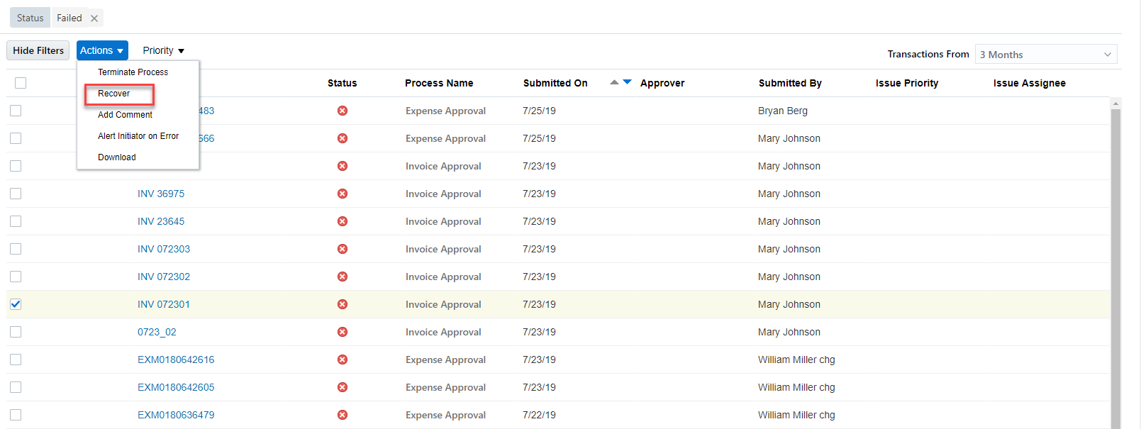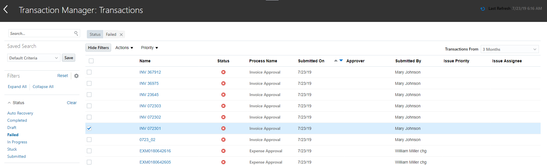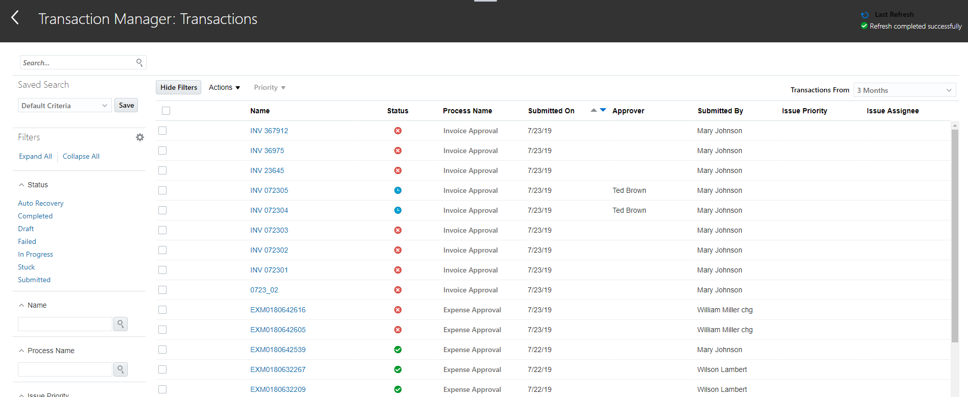 Using a single dashboard, administrators can proactively monitor all workflow tasks and resolve the exceptions for Invoice, Expenses, and Journal Approval workflows.