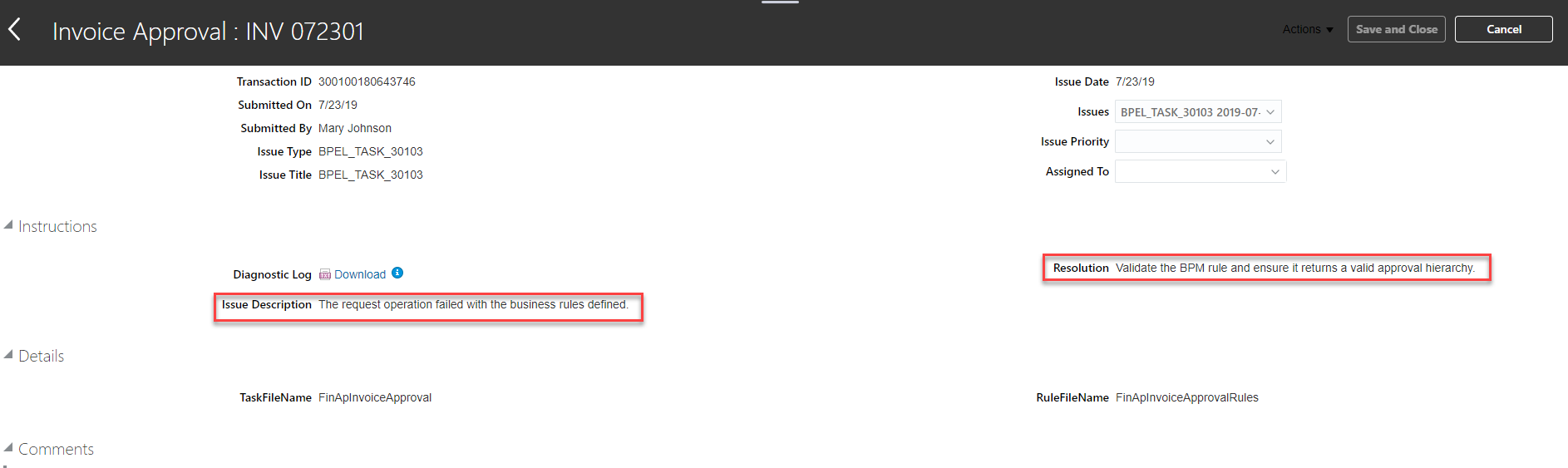 - Take appropriate actions based on the issue description and resolution. For example, you can recover a failed task after correcting the rule or withdraw a task in progress.