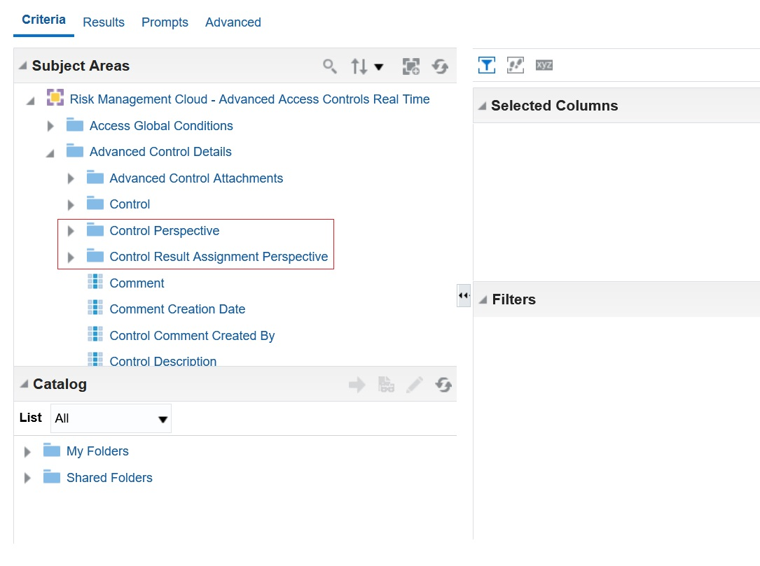 Advanced Controls has perspectives associated to two objects: controls and results. Previously, you could report only on perspectives associated to the results. In the Risk Management Cloud - Advanced Access Controls Real Time subject area and in the Risk Management Cloud - Advanced Financial Controls Real Time subject area, the Advanced Control Details folder has been enhanced to include two additional perspectives assigned to the control object. You can now report on these perspectives:
