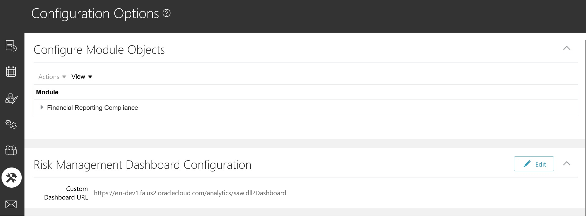 Once you've created your dashboard in OTBI, copy its URL link. Then navigate to Risk Management Setup and Administration > Configuration Options > Risk Management Dashboard Configuration, and paste the URL into the Custom Dashboard URL field. The URL is global, meaning that all users with the View Risk Management Dashboard privilege have access to the dashboard. OTBI security manages the data-level security within the dashboard and determines which tabs each user can view.