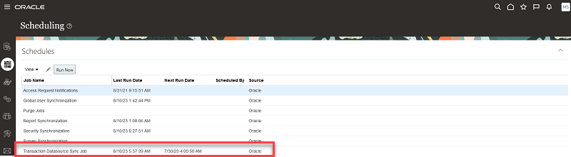 In the Setup and Administration > Scheduling page, the Transaction Data Source Sync job has been added as a seeded job. This job can be set up to run on a recurring basis or on demand. This seeding does not impact the existing locations where the Transaction Data Source Sync can be initiated.