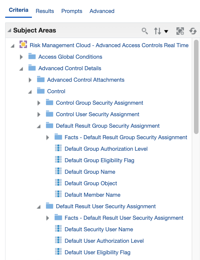 Advanced Controls has security assignments associated to two objects, controls and results. On a control, there are two kinds of security assignments, control and control result. Previously, you could report only on security assignments associated to the control (for the control object) and results. In the Risk Management Cloud - Advanced Access Controls Real Time subject area and in the Risk Management Cloud - Advanced Financial Controls Real Time subject area, the Advanced Control Details folder has been enhanced to include Control Result User Security Assignment for the control object. You can now report on these control result user security assignments: