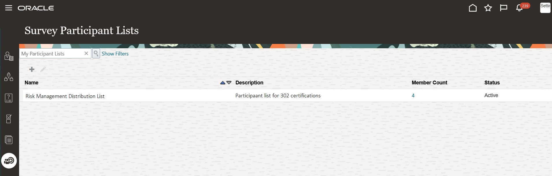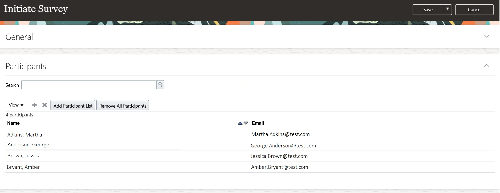 Survey Participant Lists, a new tab in the Surveys work area, empowers survey owners to manage survey participants effectively by utilizing participant lists. Survey owners can create new participant lists, each containing up to 500 participants, and can update the lists to include or exclude participants. (To do so, they must have a privilege called Complete a Survey.) A participant list can be active or inactive, and only active lists are available when a new survey is initiated.