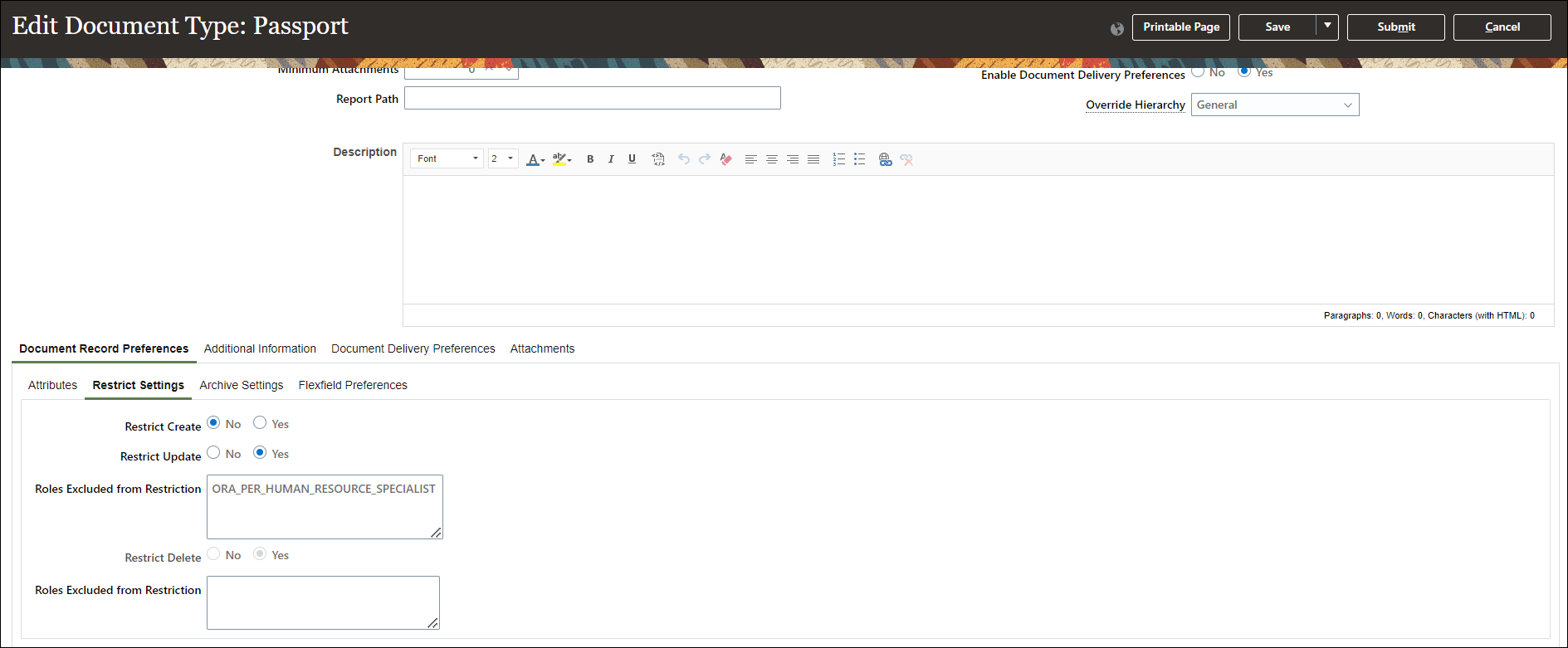 Additionally,following attributes related to archive are included in the Document Type dimension under the subject area Workforce Management - Documents of Record Real Time subject area: