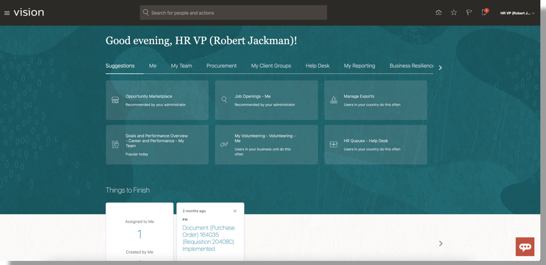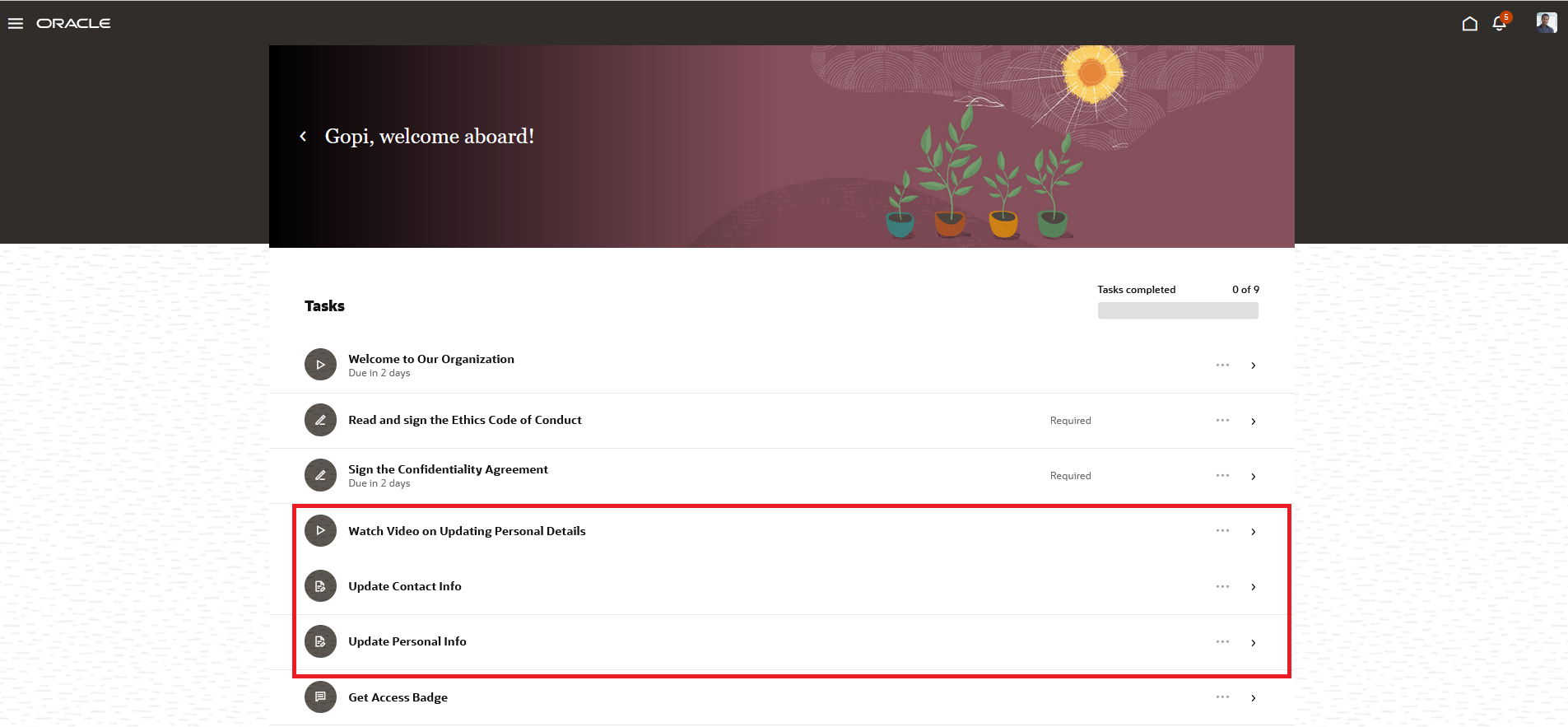| All HCM Products | Get News Feed Suggestions On Your Next Likely Actions | Get suggestions on your next likely actions in your news feed layout. This feature is currently in Controlled Availability and is available in Oracle Fusion Cloud HCM, Financials, Project Management, and Procurement. Artificial intelligence and machine learning algorithms predict and suggest the actions each user is most likely to take during a session. The algorithms use historic navigation behavior and patterns of each user and users like them to determine which navigation target they’re most likely to visit. |
