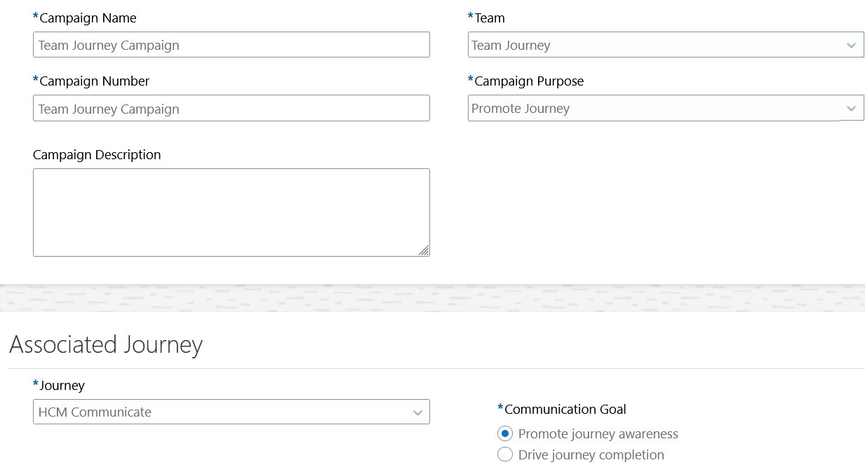 The campaign administrator needs to create a communication team with Promote Journey as the purpose of the campaign. This setup enables the campaign manager to select Promote Journey when they create the campaign.