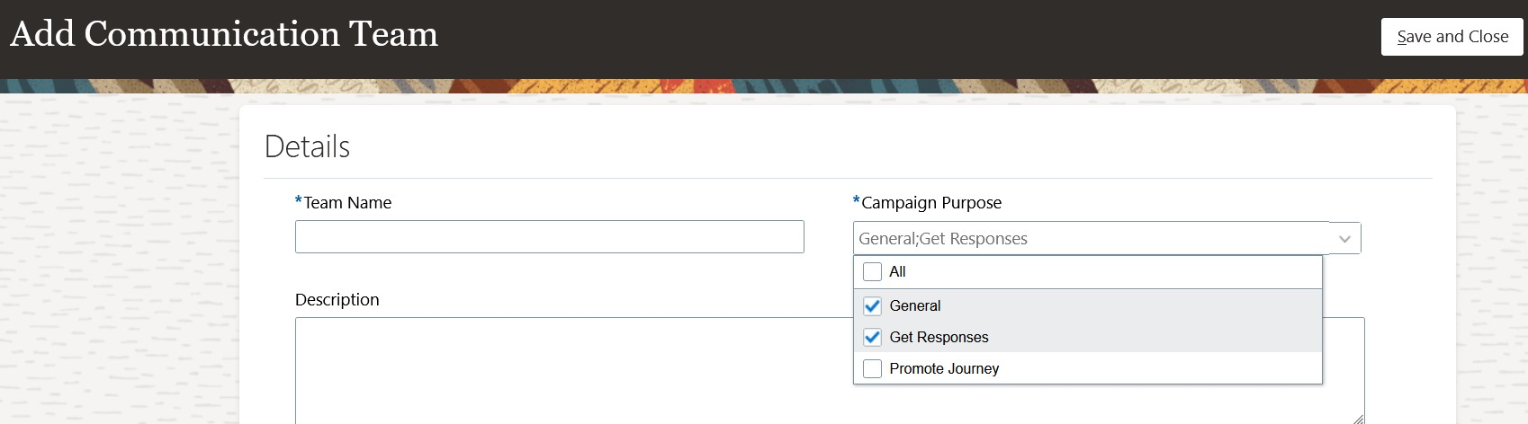 In the Details section, enter a name and description for the communication team. Select the campaign purpose.