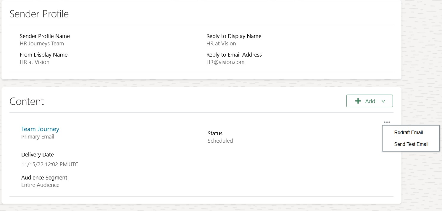 Give campaign managers the ability to configure campaigns that send communications on behalf of senior management using sender profiles. As a campaign manager with sender profiles, you can preview emails with a sender profile before activating a campaign. Before this, preview emails used the sender profile associated with the application, not those assigned to the campaign. To start using sender profiles in test emails, the campaign administrator needs to create a sender profile and associate it to a communications team. The campaign manager can then create a campaign with that communication team and send a test email using the sender profile before activating the campaign.