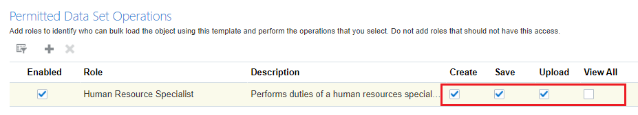 The Human Capital Management Integration Specialist job role has View All access to all business objects. Users with this job role will not be restricted in the data they can create and maintain using HCM Spreadsheet Data Loader.