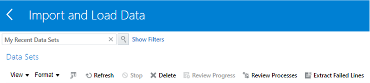 On the Import and Load Data page, initiate the file generation for a data set in error, or a single business object within a data set, by clicking the Extract Failed Lines button on the table toolbar.