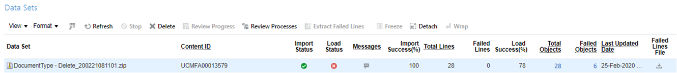 You can now generate a zip file containing the file lines for each business object that failed to load in the data set. Each .dat file includes the SET and METADATA lines, followed by the MERGE and DELETE lines that didn't successfully load.