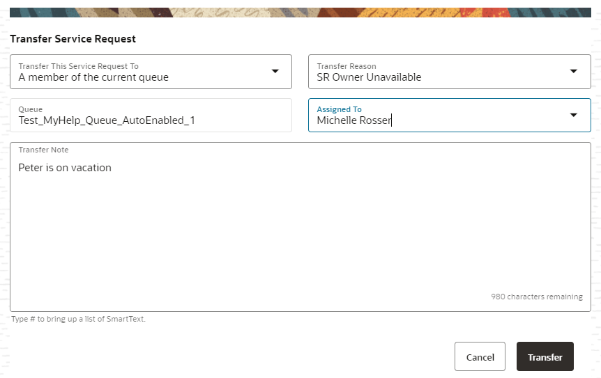 Transfer Service Request is part of the Help Desk in the Redwood Experience, available to licensed Help Desk customers upon request. Contact your Customer Success Manager, Center of Excellence sponsor, or Account Executive for details.