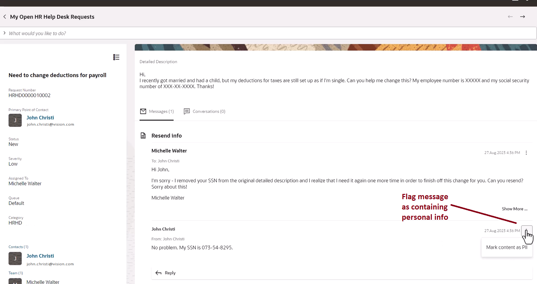 When a Help Desk agent recognizes that Personally Identifiable Information (PII) has been included in a Help Desk message, they can now mark the message as containing PII.