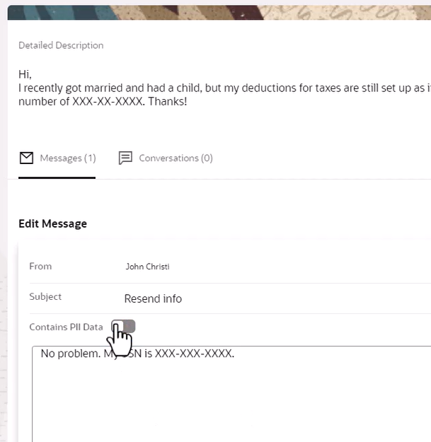 Starting in 23C, Help Desk Agents are given permissions in the standard job roles to be able to mark the messages as containing Personally Identifiable Information (PII). However, this feature must be enabled for the option to be visible. (See Steps to Enable above.)
