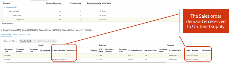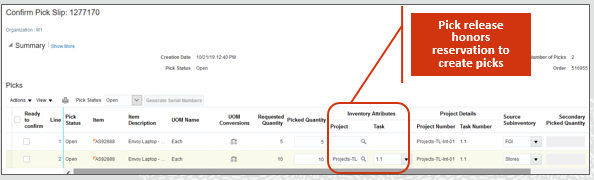 - Automatically or manually reserve materials to a project or project task, or from common inventory, based on the values specified for the project attributes on the sales order, transfer order, or shipping request