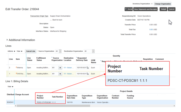 - Use the Create Interorganization Transfer task to transfer project material across inventory organizations.
