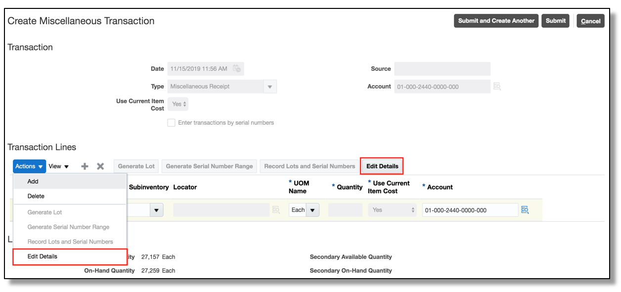 - Use the Create Miscellaneous Transaction task to issue or receive project material.