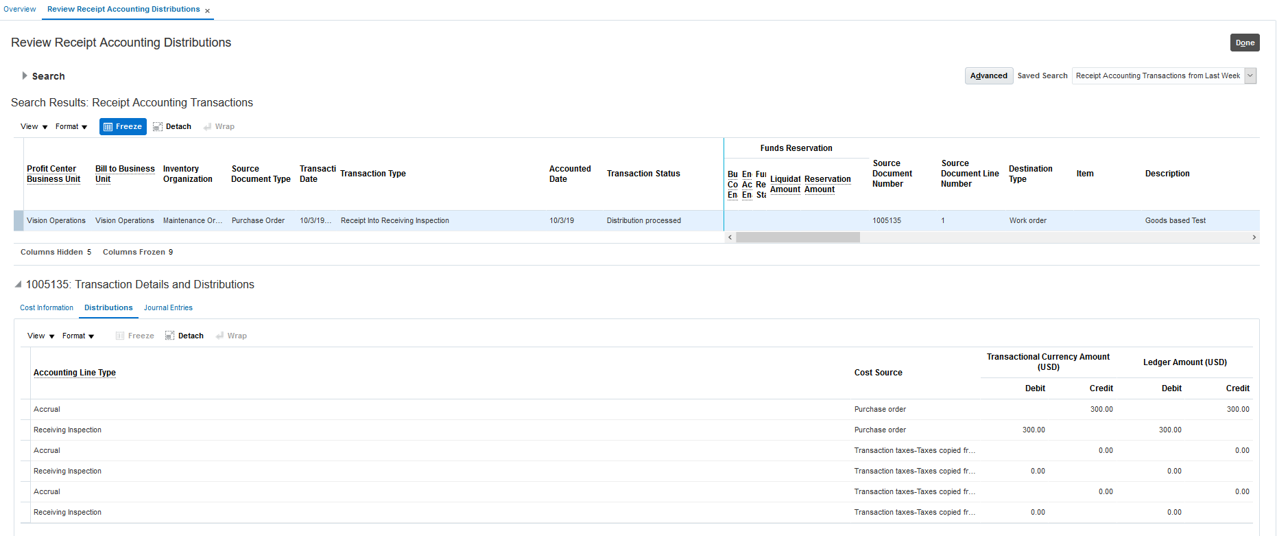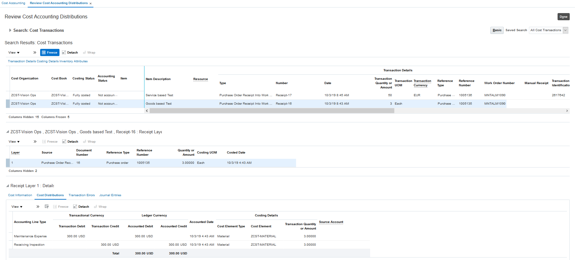 A description-based receipt transaction used to get accounted as an expense in Receipt Accounting. Now, it gets created as a logical transaction in Cost Accounting, resulting in a cost against the maintenance work order.