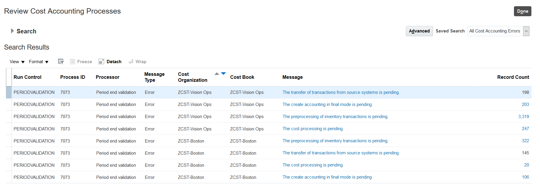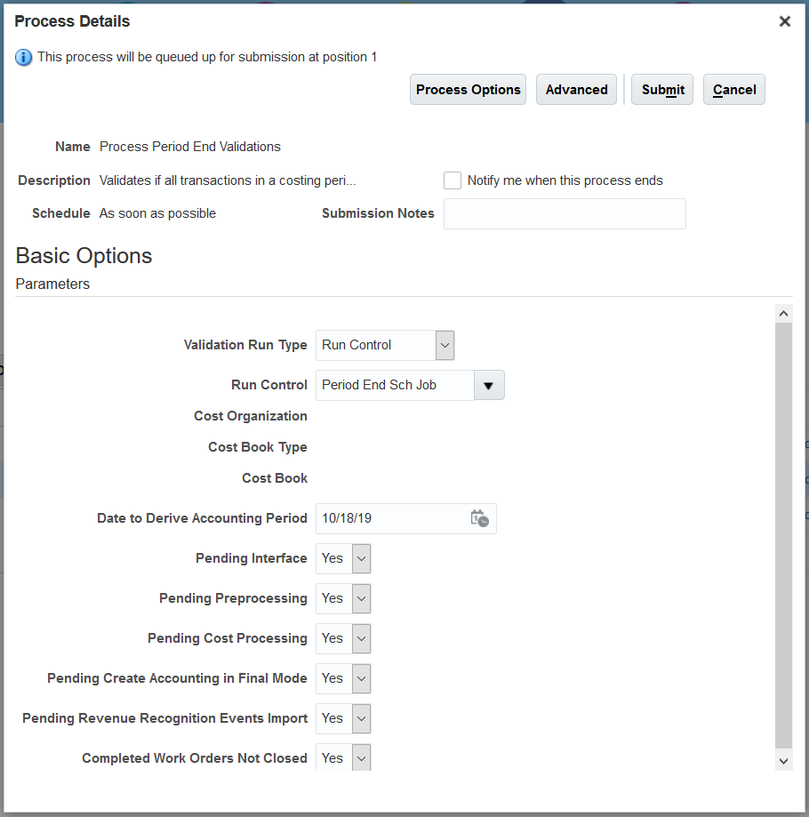 Use the Process Period End Validations scheduled process to efficiently review period end validation issues for a group of cost organizations within a run control setup or for all cost organizations to which you have access.