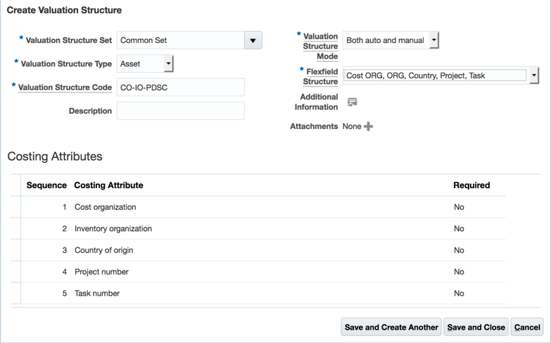 If you enable country of origin tracking in Oracle Inventory Management Cloud, set up your valuation structure in Oracle Cost Management Cloud to include country of origin to enable tracking inventory values by country of origin as shown below.