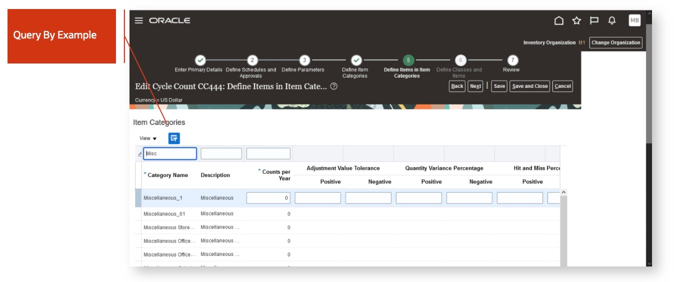 - Use Query By Example to Search Item Categories When Defining a Cycle Count