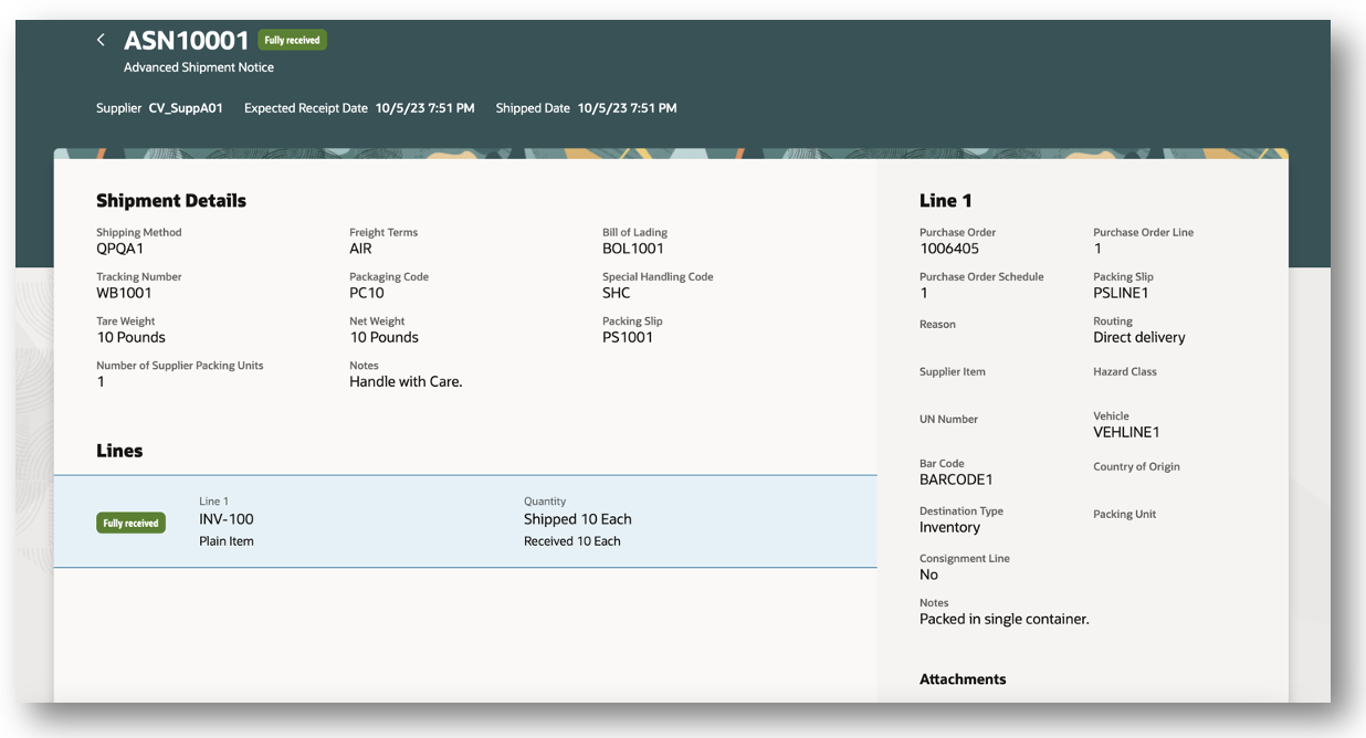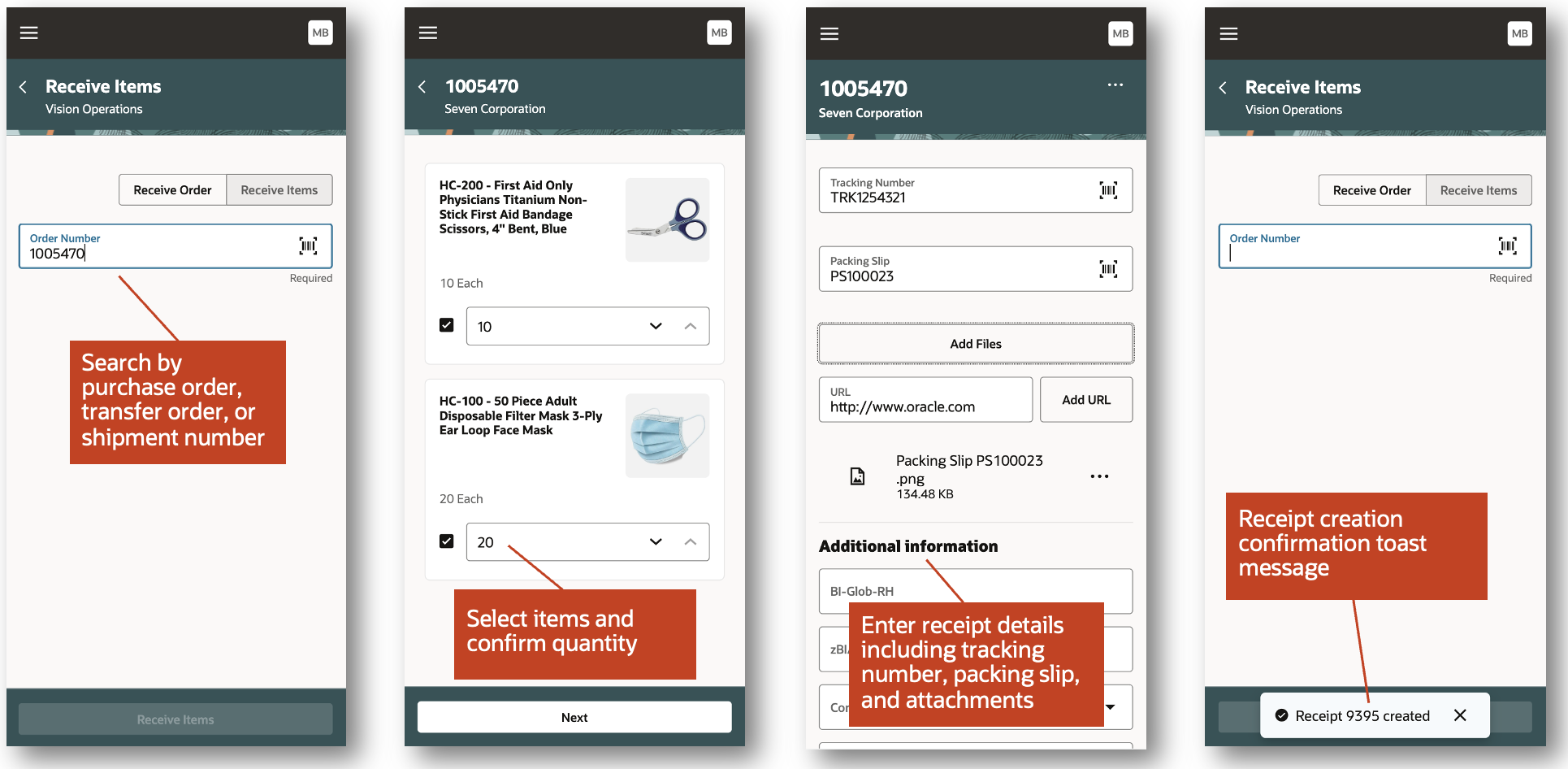 Improve your organization's receiving process by using a mobile device to receive your goods. You can search for your expected shipments by scanning a barcode identifier or entering a purchase order, transfer order, or shipment number. You can save time by selecting multiple items when performing a receipt. You can optionally enter receipt details such as tracking number, packing slip, attachments, and descriptive flexfields. Once you've entered your receipt details and submitted the transaction, you'll receive a confirmation toast message indicating that the receipt was successfully created.