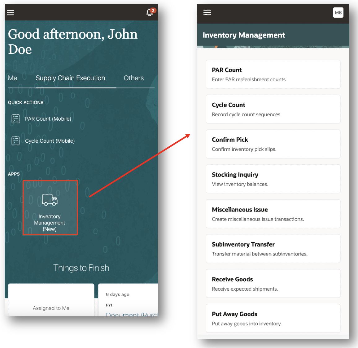 You can access the new mobile flows by clicking the Inventory Management (New) menu entry under the Supply Chain Execution navigation group. Alternatively, you can directly navigate to individual mobile pages by clicking on the individual Quick Actions. For example, clicking the PAR Count (Mobile) quick action takes you directly to the PAR Count mobile page.