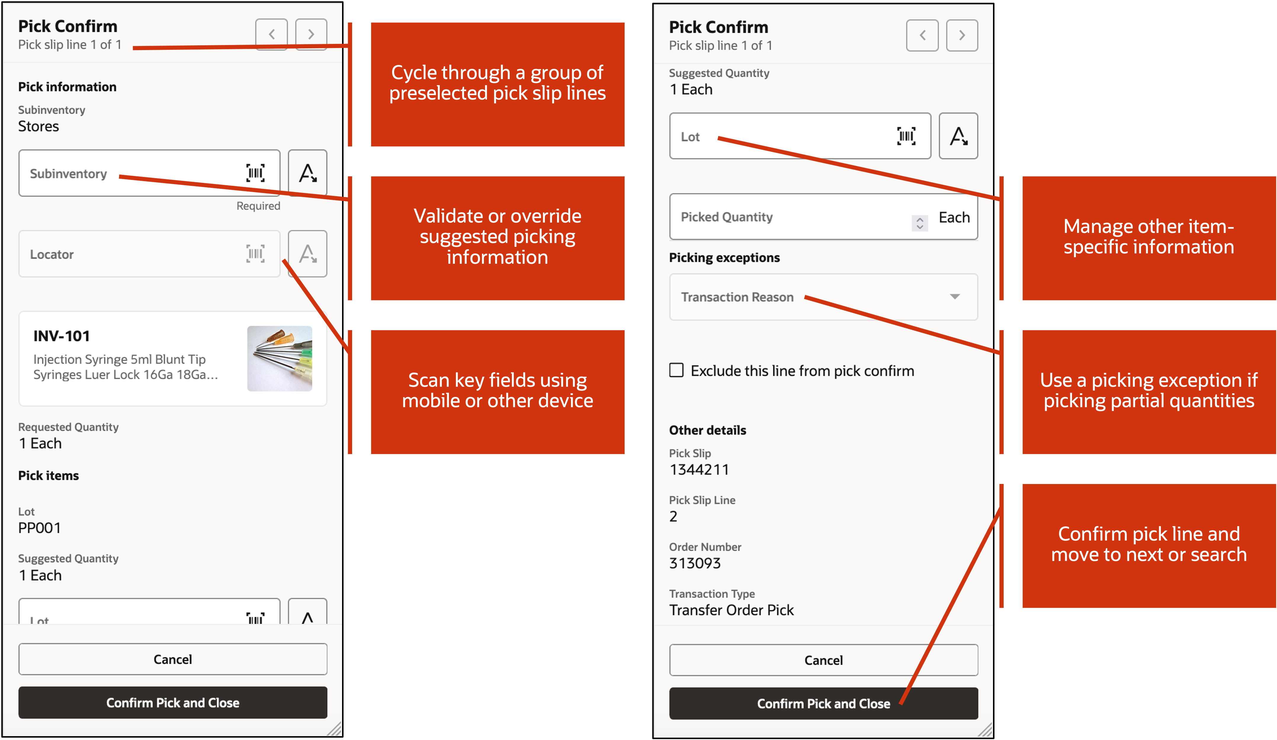 Use a mobile device to perform picking transactions in real time, while physically moving goods from a source to a destination subinventory (staging). Search for open pick lines by pick slip number or order number, and then validate picking information by scanning barcoded identifiers or entering them manually.