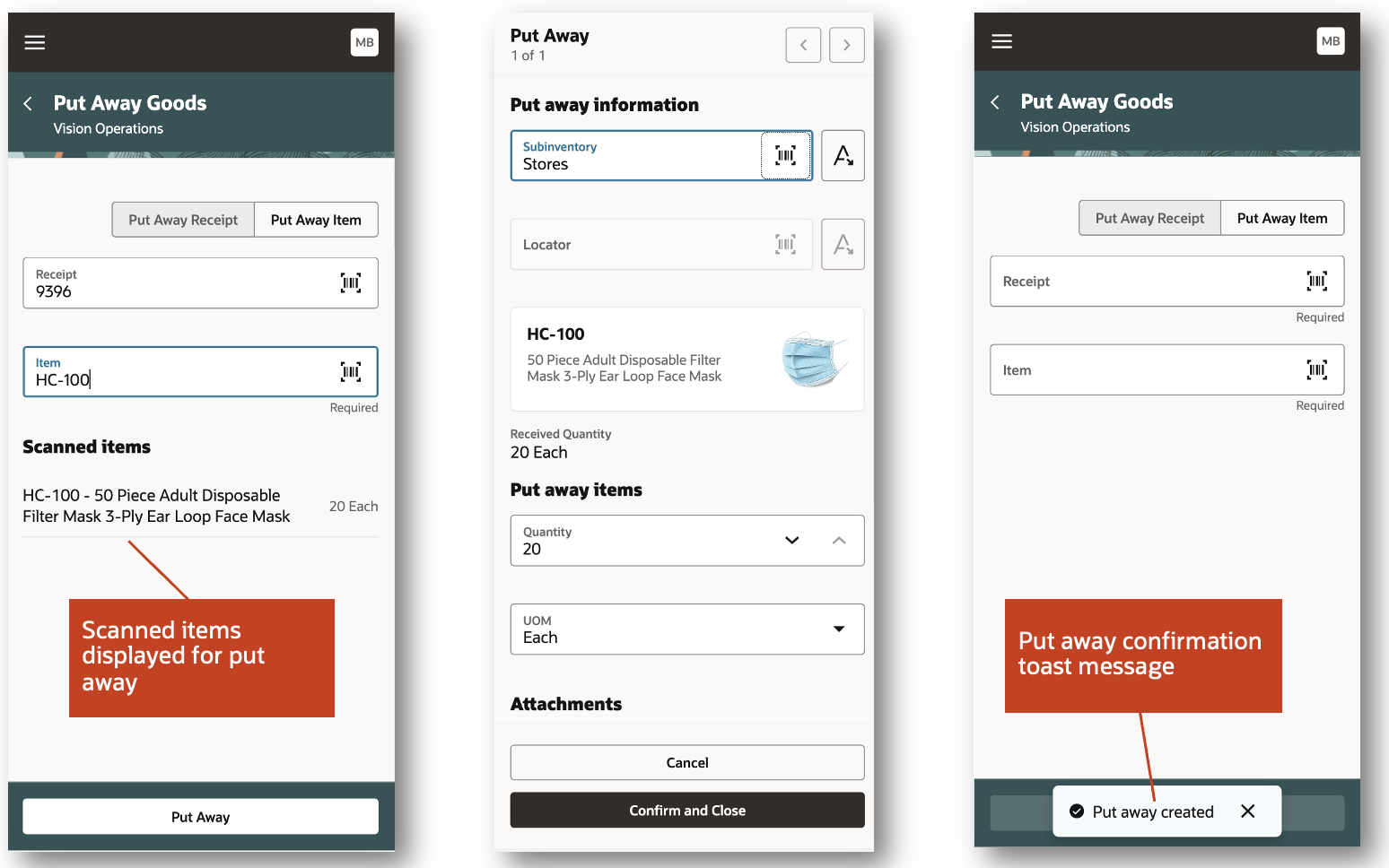 Once you've received your goods, you can easily perform the put away transaction using a mobile device. You can search for your receipts to put away by scanning the receipt or item barcode identifier. Alternatively, you can search by entering the receipt or item number. You can streamline your put away process by selecting multiple items to put away. You can either scan or enter the put away subinventory and locator. You can also select the subinventory and locator using a list of values. In the event the item is lot controlled, serial number controlled, or both, you can scan the associated barcode identifier or enter the lot and serial number. Once you've entered the put away details and submitted the transaction, you'll receive a confirmation toast message indicating that the put away transaction was successfully created.