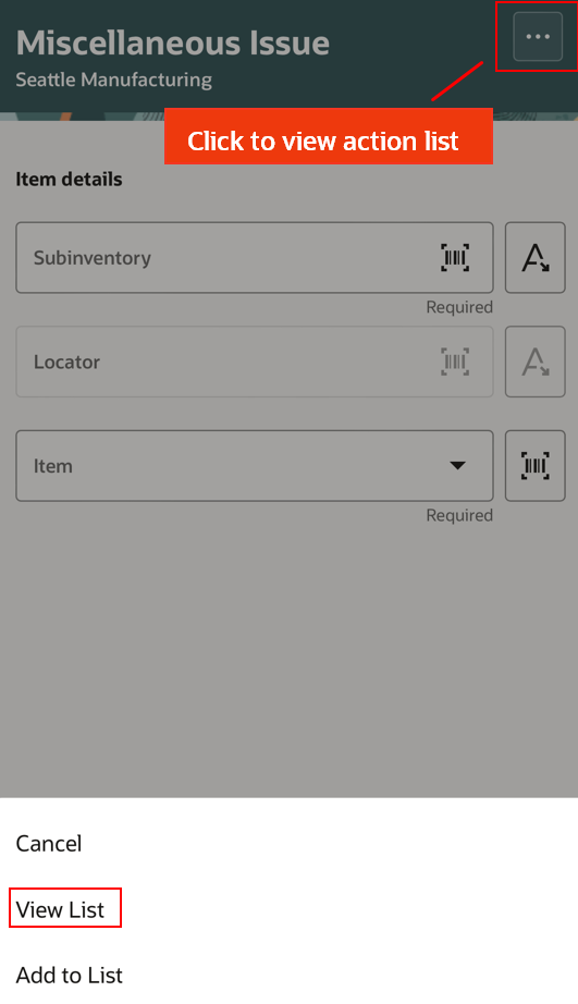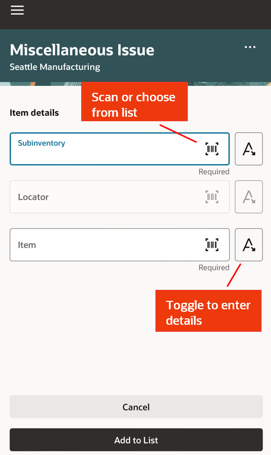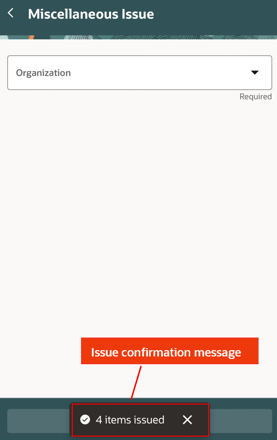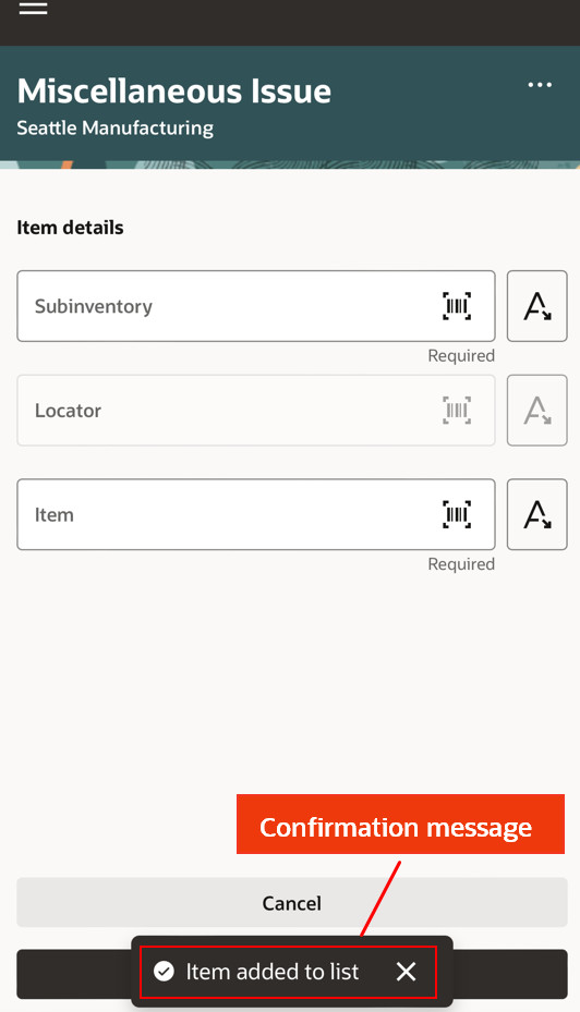 The Miscellaneous Issue mobile page provides an enhanced experience where you can scan using the barcode scanner and issue material.