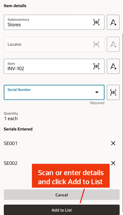 You can now use a mobile device to perform cycle counts, receiving, put away, stocking inquiries, stock issues, pick confirm, subinventory transfers, and periodic automatic replenishment (PAR) counts. These mobile flows support scanning relevant barcode data using either a camera-based or device-based scanner.