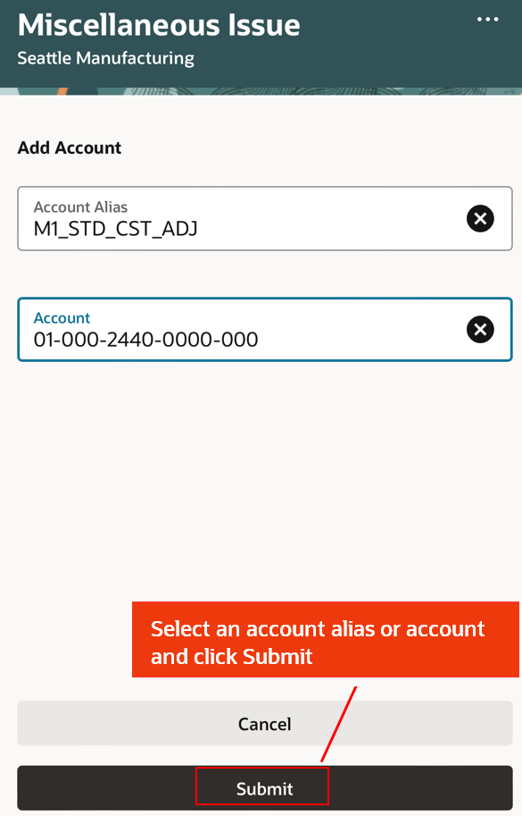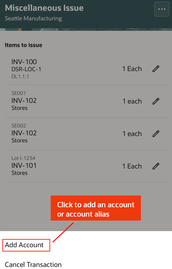 Using the Miscellaneous Issue mobile page, users can issue out material against an account alias or account number. You now have the ability to walk over to the stocking location, scan the location information (subinventory and locator), scan the item, enter the quantity, and issue the item.