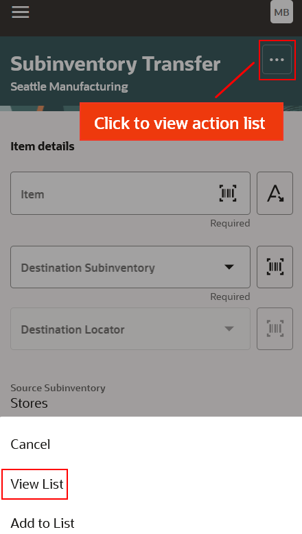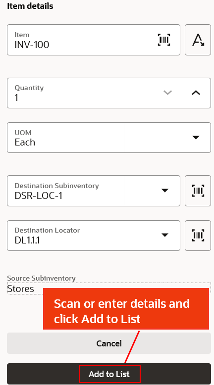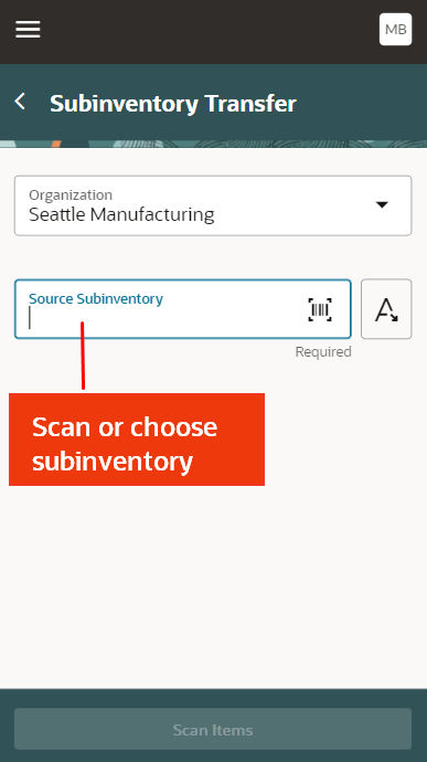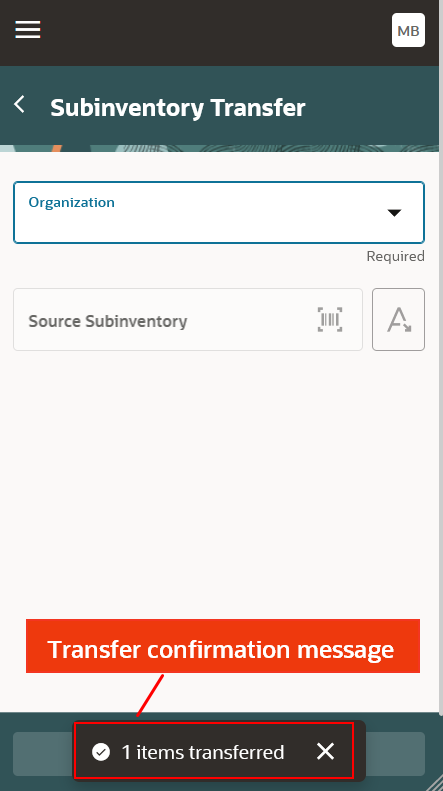 The Subinventory Transfer mobile page allows you to perform transfers from a source to a destination subinventory by using the barcode scanner.