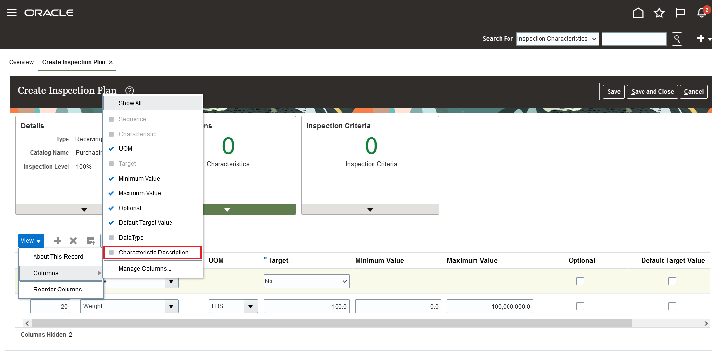 You can now view the description of an inspection characteristic when you create, edit, or view the list of inspection characteristics and their specifications on the Inspection Plan page. You can opt to either add or remove the Characteristic Description column from the Specifications table. By default, the Characteristic Description column is hidden.