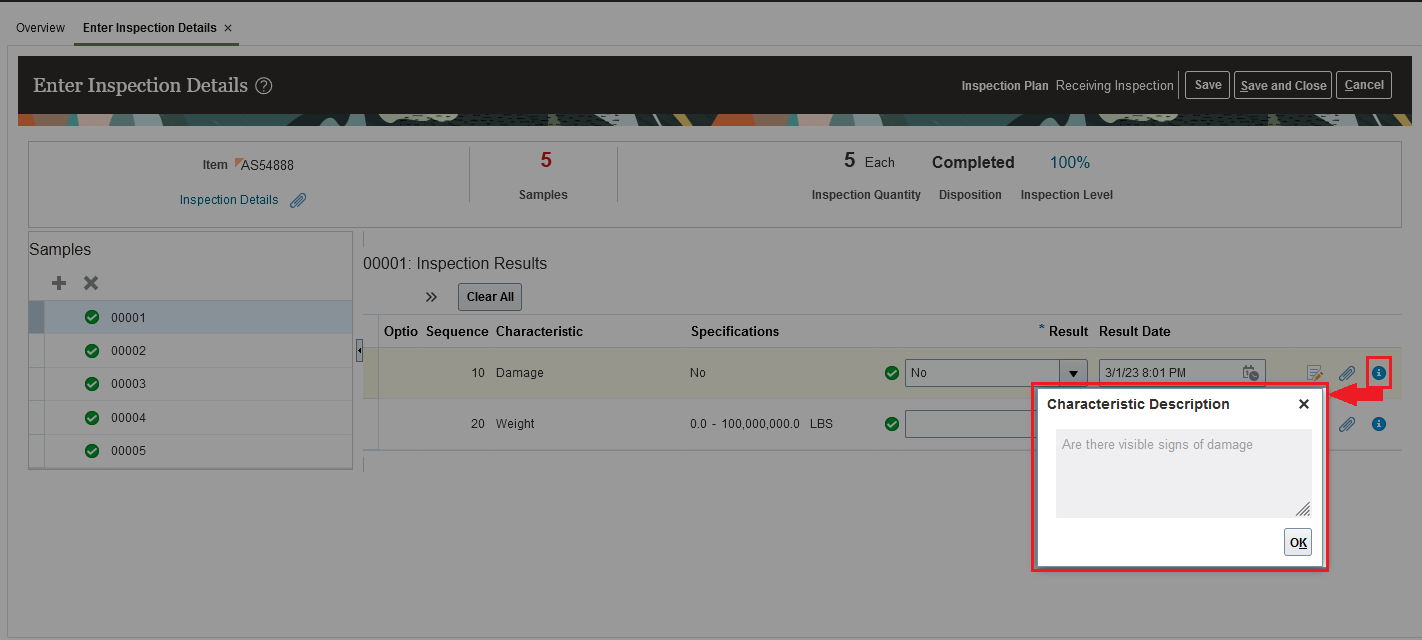 You can also click the information icon for a specific inspection characteristic on the Inspection page to view the inspection characteristic description.